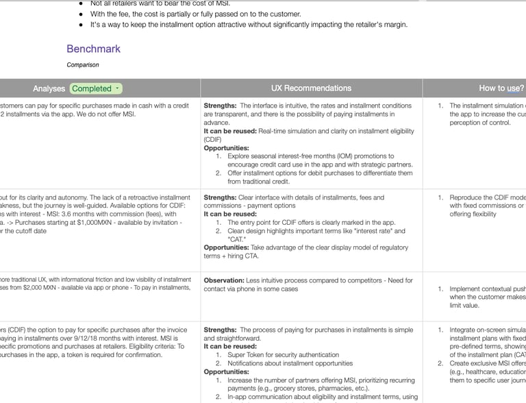 Iniciei com um benchmarking aprofundado de como bancos e fintechs no México apresentam tarifas e modelos de parcelamento na experiência do usuário. O objetivo era identificar padrões de mercado, melhores práticas e riscos a evitar, especialmente em relação à percepção de transparência e confiança. O resultado virou uma documentação estruturada apresentada para a squad completa: PM, engenharia, BA e designers.